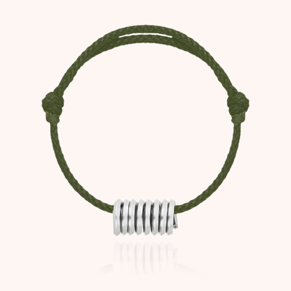 This 925 sterling silver bracelet features a spring-shaped pendant, crafted from square wire. Balancing geometric precision with intentional irregularity, it embodies a contemporary aesthetic—both understated and bold. Strung on a waxed cord, it wears like a signature piece, a subtle reflection of the personality of the one who chooses it.