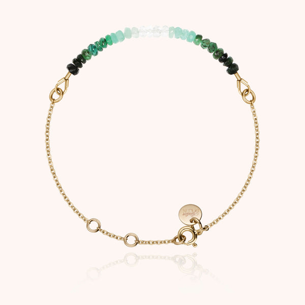 Sparkling, the gradient of emeralds is set on a delicate chain to embrace your wrist. Each gemstone is hand-selected and assembled in our Parisian atelier.
