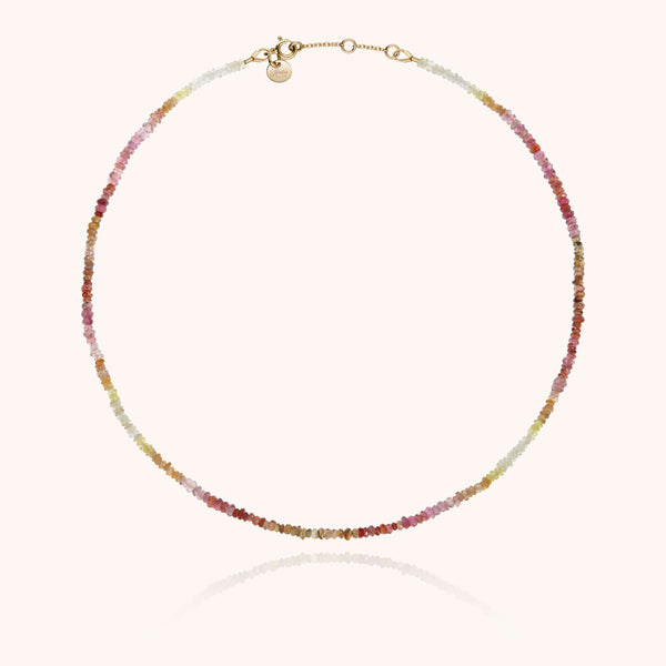 A river of sapphires in autumnal hues creates a unique gradient. Each gemstone in the rivière necklace is carefully selected and hand-assembled in our Parisian atelier.