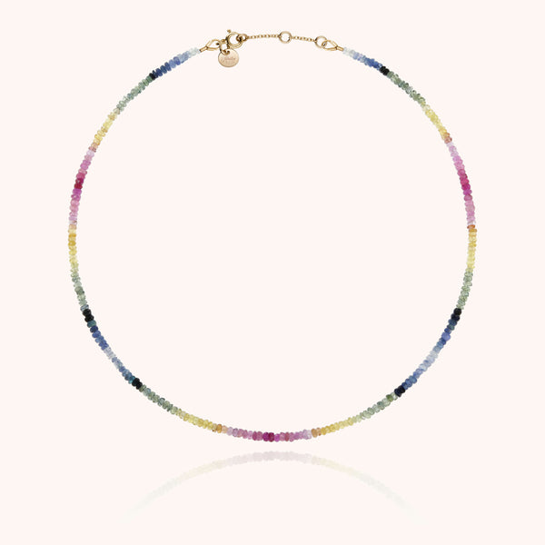 A cascade of rainbow-colored sapphires creates a unique gradient. Each gemstone in this rivière necklace is carefully selected and hand-assembled in our Parisian Atelier.