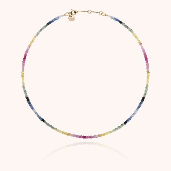 A sapphire river in rainbow colors forms a unique gradient. The precious stones of the river necklace are selected and assembled by hand in our Parisian workshop.