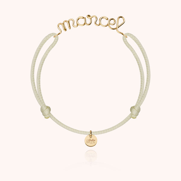 Il braccialetto con cordoncino è un gioiello di espressione, un gioiello di emozione simbolo di un legame. Personalizza il tuo braccialetto con una parola, un nome, un soprannome o lettere care al tuo cuore. Il filo d'oro modellato dagli artigiani della Maison è montato su un cordoncino in cotone colorato.