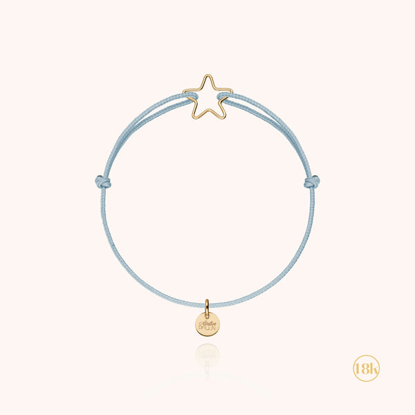 Il filo d'oro 750/1000 prende la forma di una stella e accompagna i più piccoli per ogni celebrazione. Un perfetto regalo di nascita o di battesimo. Regolabile grazie ai nodi scorrevoli, il braccialetto con cordoncino si adatta al polso del bambino.