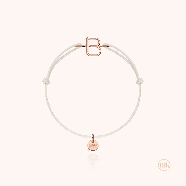 Un regalo unico per i momenti speciali della vita - un'iniziale incisa che cattura l'essenza dell'emozione. Ideale per le nascite, i battesimi e tutte le occasioni memorabili. Il braccialetto mette in risalto iniziali delicatamente modellate a partire da un prezioso filo d'oro 18kt., accuratamente confezionato a mano. Ogni pezzo è personalizzato con la lettera di vostra scelta, creando così un legame prezioso con colui o colei che lo indossa. Montato su un braccialetto cordoncino in cotone colorato, questa creazione senza tempo è appositamente progettata per i bambini, unendo eleganza e durata per accompagnare il vostro caro in tutte le sue avventure.