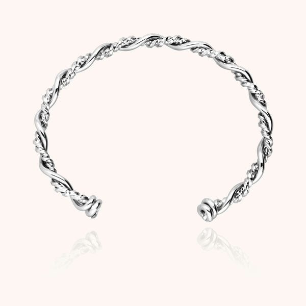 Trois fils d'argent s'entrelacent pour donner vie à une torsade unique et singulière façonnée par les artisans de la Maison. Cette fine manchette s'accumule avec des bracelets jonc à la perfection.