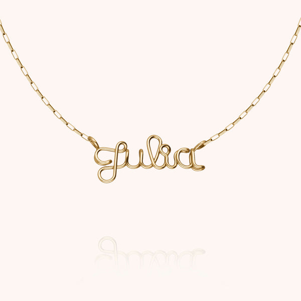 La collana Richelieu personalizzata si presenta su una catena Rettangolo grafico, in oro giallo laminato. Il filo modellato a mano forma la parola o il nome di vostra scelta, in una creazione su misura sia elegante che portatrice di emozione. Un pezzo senza tempo, pensato per essere un tutt'uno con voi.