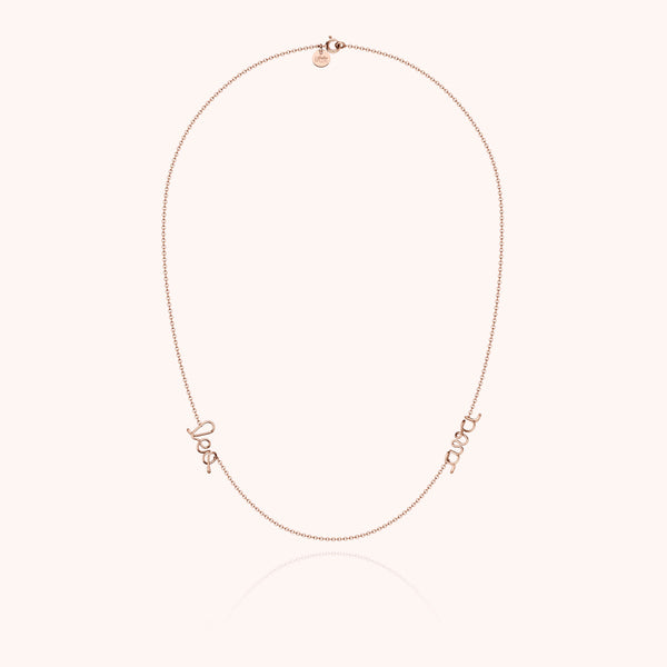 Personalizza il tuo collier Richelieu Duo con due nomi, un messaggio o una combinazione unica di due parole. Ogni lettera è modellata a mano da un filo d'oro rosa laminato, poi montata su una delicata catena di 45 cm. Un gioiello su misura, da indossare vicino al cuore o da offrire come legame intimo e prezioso.
