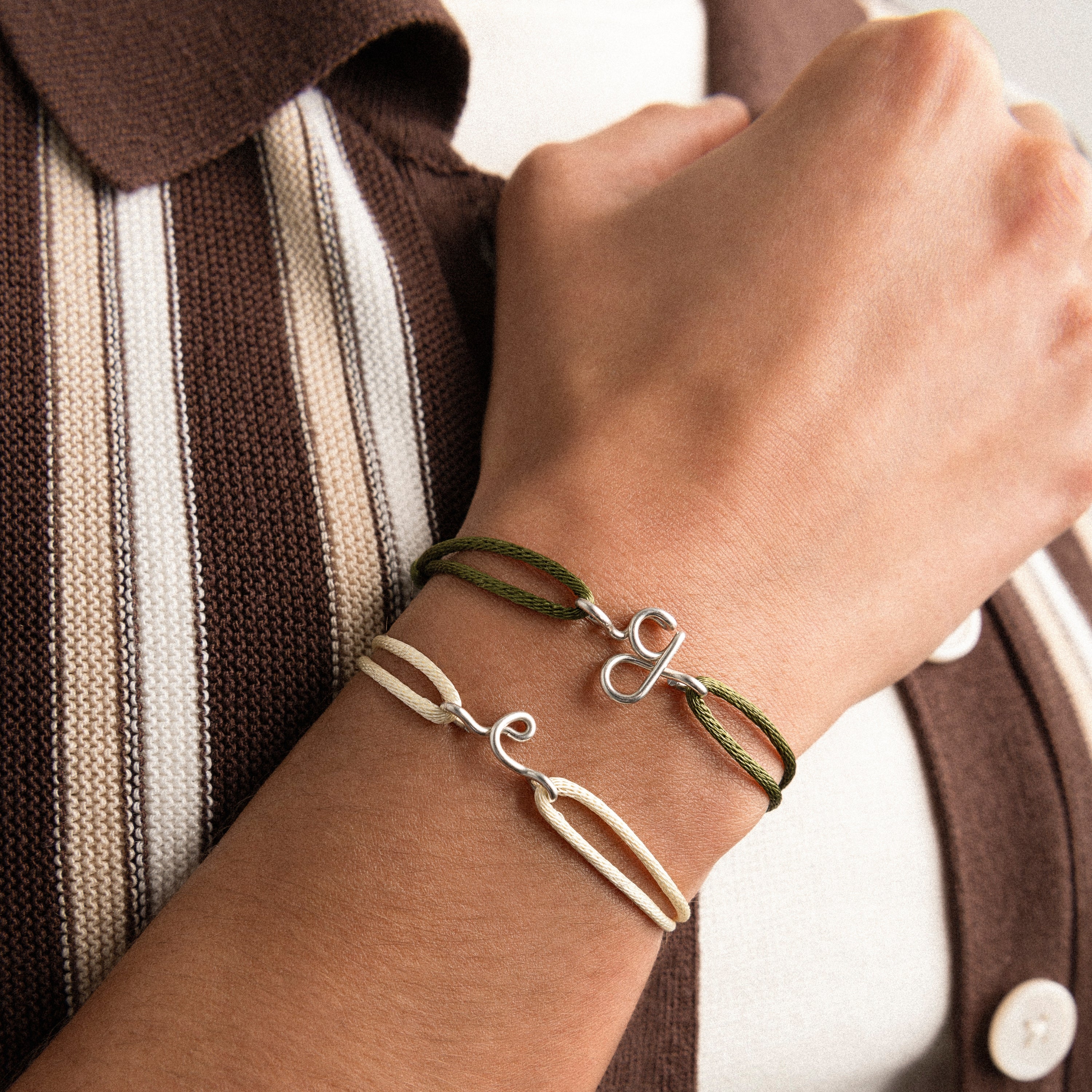 Una lettera, un'intenzione, un legame. Questo bracciale con cordino presenta un'iniziale in corsivo realizzata a mano con filo d'argento sterling. Da indossare da solo o in combinazione, si adatta a tutti i polsi, sia di bambini che di adulti. Un gioiello personalizzabile, discreto e simbolico, ideale per segnare una presenza o offrire un messaggio intimo.