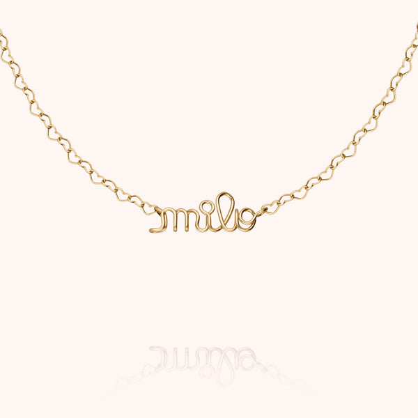 Una parola d'amore vicino al cuore. La collana Richelieu si unisce a una catena Cuore per una versione tenera e luminosa. Ogni lettera è modellata a mano su un filo in oro giallo gold filled 14K, creando un gioiello tanto personale quanto poetico. Un'attenzione su misura da regalare o regalarsi.