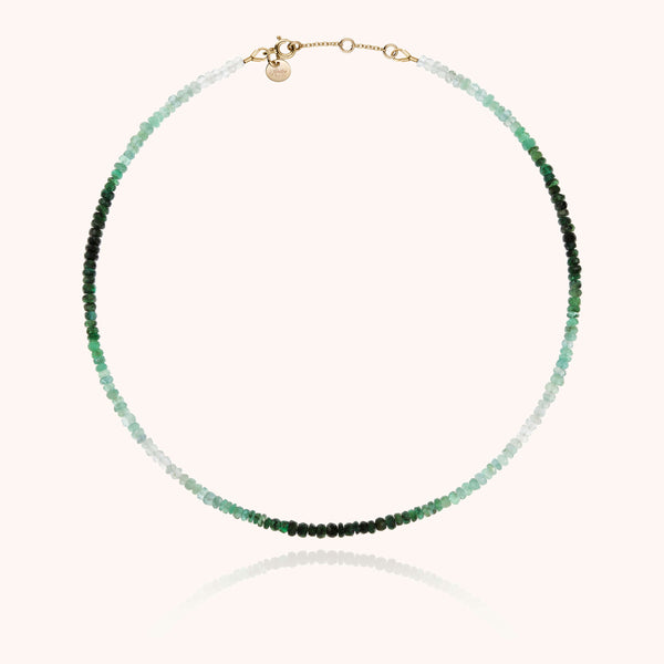 Un fiume color smeraldo forma un gradiente unico. Le pietre preziose della collana River sono selezionate e assemblate a mano nel nostro laboratorio parigino.