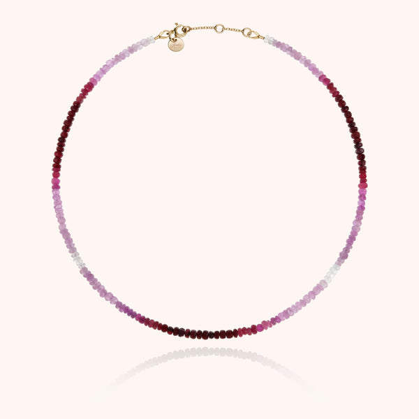 Un fiume di rubini forma una sfumatura unica. Le pietre preziose della collana River sono selezionate e assemblate a mano nel nostro laboratorio parigino.