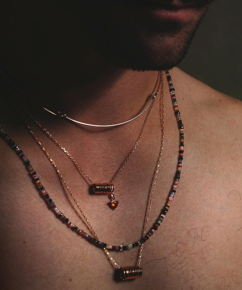 Quand Alexandre Misericordia, fondateur de DUSTIJL 1979, s'associe à Atelier Paulin, le design devient une exploration de l’intimité des objets. Inspirée par les talismans et fragments de métaux oubliés, cette collection dévoile des bijoux aux formes irrégulières, familières et intrigantes. Parmi les pièces phares, la bague de foulard, une arabesque d’or, se porte aussi bien au doigt qu’autour d’un foulard, offrant une double fonction. Chaque création incarne la force émotionnelle et le symbolisme des objets du quotidien.